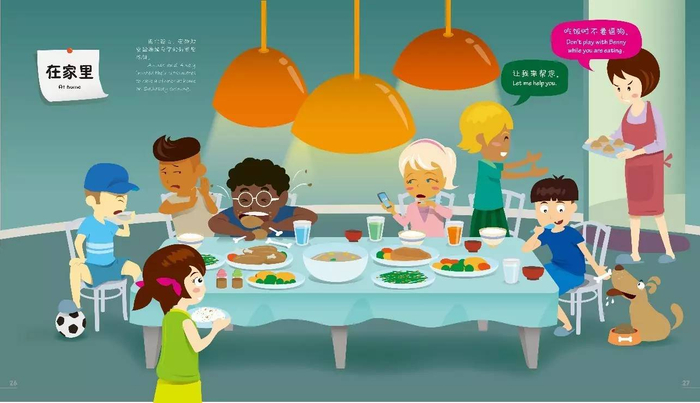 小鹏说礼:大部分餐桌礼仪是全球通行的,但在不同类型的餐厅还是有所不同。如在高档西餐厅用餐时,要注意保持安静;在家里吃饭时,不要狼吞虎咽,可以帮忙做一些力所能及的事情,吃饭的时候也不要逗狗玩;在快餐店排队点餐时,选好一个队伍排队并在排队时想好点餐内容。