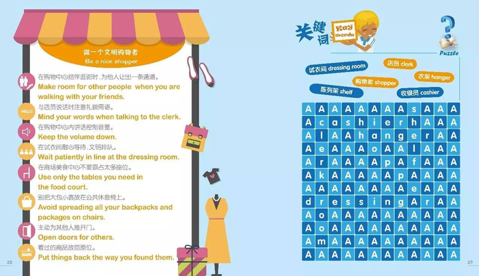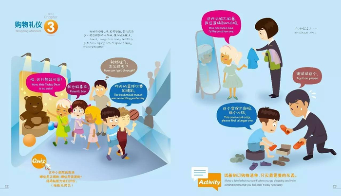 小鹏说礼:结伴逛街时要为他人让出一条通道,在试衣间耐心等待文明排队,与店员说话时注意礼貌用语,看过的商品放回原位。