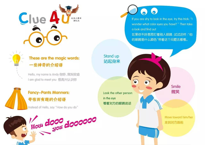 小鹏说礼:打招呼的时候要看着别人的眼睛,如果东张西望或者低着头是不礼貌的,可以尝试说一些有趣的介绍语。如果你不好意思盯着别人的眼睛,可以带着“他的眼睛是什么颜色的?”这种好奇心去试试看。小鹏有四个小妙招帮你克服羞怯:站起来,走到对方面前,微笑,看着对方的眼睛说话。