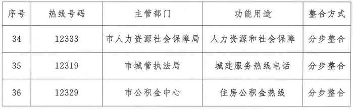 分步整合的热线号码共有5个,分别为人力资源和社会保障热线12333、消费维权投诉热线12315、住房公积金热线12329、城市建设服务热线12319、交通运输服务监管热线12328。