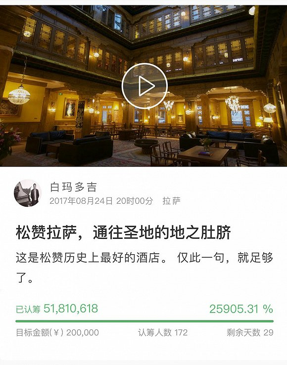 8月24日晚上八点,第八家松赞酒店——松赞拉萨曲吉林卡酒店在“开始吧”进行众筹,目前众筹已突破5000万元,成为该平台认筹额最高的项目。