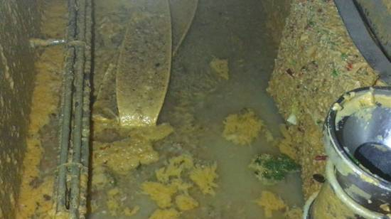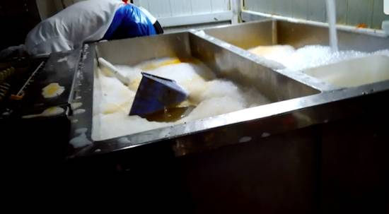 记者想更深入地观察洗碗机内部,于2017年6月18日早7点打开了洗碗机的机箱盖,可以看到传送带一侧沾满了油渍,并散发出阵阵腐烂的恶臭。洗碗机内壁上沾满了油渍和腐烂的食物残渣,洗碗机内的蓄水池满是黄色的污水。记者把洗碗机蓄水池里的水排净后发现,蓄水池内壁上沾满了的油脂,用手可以刮下厚厚的一层。蓄水池内还可以清晰的看到一些掉落的碗盘,上面早已沾满了油脂。