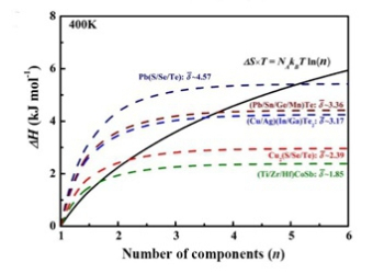 在多元热电材料体系中,构型熵取决于体系中的固溶元素种类和各自的固溶度,而能否形成具有一定固溶元素种类和固溶度的关键在于体系的固溶焓与构型熵之间的竞争。研究团队首先建立了弹性力学模型对系列二元和多元热电材料体系的固溶特性进行了评估,获得了决定体系构型熵上限的本征固溶因子d 判据,根据该判据可对各种热电材料体系能否实现高熵固溶进行有效筛选,如Cu2(S/Se/Te)、半赫斯勒合金多元热电材料可以实现3元的等比例高熵固溶,类金刚石结构(Cu/Ag)(In/Ga)Te2和 (Pb/Sn/Ge/Mn)Te族化合物可实现4元等比例高熵固溶。