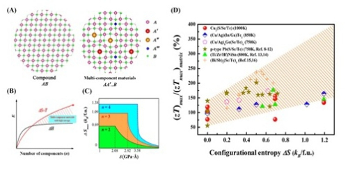 多元高熵热电材料的示意图(图A-C)以及熵对热电优值ZT的优化(图D)