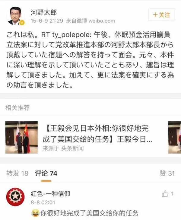 在大会发言中,他指责中国在南海的维权行为,表示日本支持美军的"航行自由作战"行动。针对这一发言,王毅外长对河野太郎说:"你很好地完成了美方交给你的任务"。