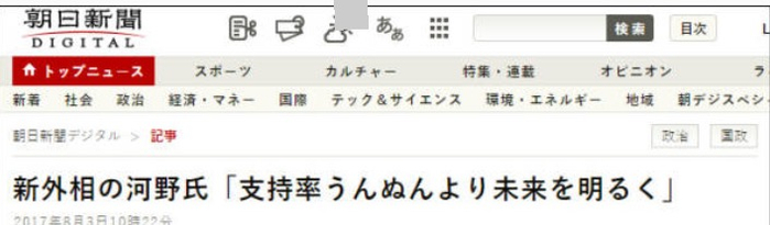 今年8月3日,河野太郎成为安倍内阁的重要阁僚:外务大臣。创下日本宪政史上父子同为外务大臣的记录。