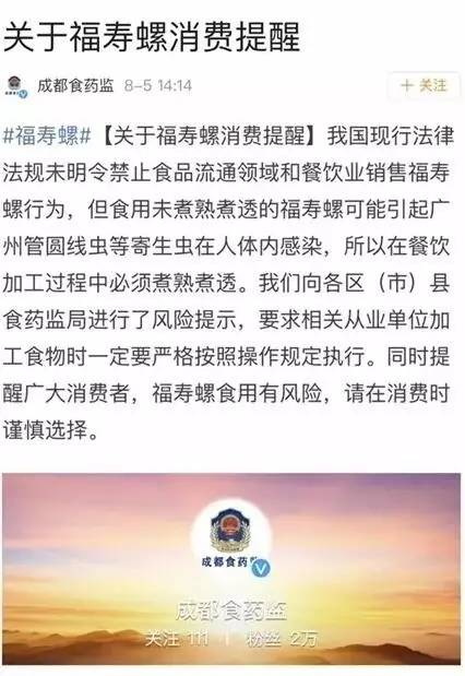 小编搜索发现,今年8月初,“福寿螺”的食安问题也曾在成都引发关注,当地食药监局还专门对此发布了一条消费提醒: