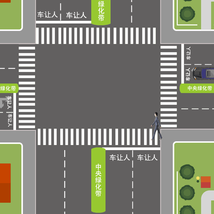 当道路两侧有绿化带,行人走斑马线还未穿过绿化带时,紧贴绿化带车道的车辆需要停车让行;当行人走斑马线已穿过绿化带时,所有车道的车辆都必须停车让行。