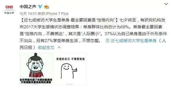 【近七成被访大学生是单身 最主要因素是“性格内向”】七夕将至,有研究机构发布2017大学生感情状态调查结果:单身群体比例总计为69%。单身最主要因素是“性格内向,不善表达”,其次是“人际圈小”。37%认为自己单身是由于外形条件不出众,另有27%享受单身生活,不想恋爱。