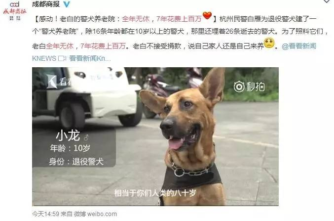 【感动!老白的警犬养老院:全年无休,7年花费上百万】杭州民警白雁为退役警犬建了一个“警犬养老院”,除16条年龄都在10岁以上的警犬,那里还埋着26条逝去的警犬。为了照料它们,老白全年无休,7年花费上百万。老白不接受捐款,说自己家人还是自己来养。