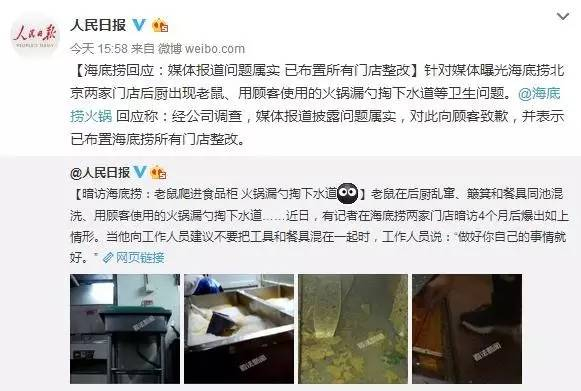 【海底捞回应:媒体报道问题属实 已布置所有门店整改】针对媒体曝光海底捞北京两家门店后厨出现老鼠、用顾客使用的火锅漏勺掏下水道等卫生问题。海底捞火锅 回应称:经公司调查,媒体报道披露问题属实,对此向顾客致歉,并表示已布置海底捞所有门店整改。