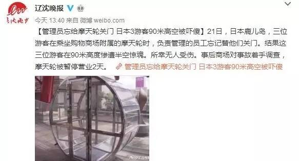 【管理员忘给摩天轮关门 日本3游客90米高空被吓傻】21日,日本鹿儿岛,三位游客在乘坐购物商场附属的摩天轮时,负责管理的员工忘记替他们关门。结果这三位游客在90米高度惨遭半空惊魂。所幸无人受伤。事后商场对事故着手调查,摩天轮被暂停营业2天。