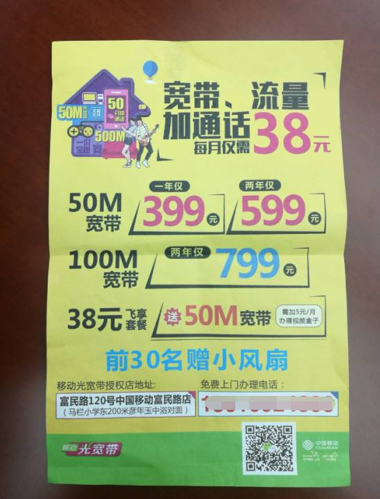 记者看到,本次宣传单的内容是一家通讯公司主推的宽带业务。