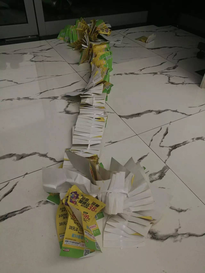 在派出所一楼大厅,记者还看到了一串用胶带捻在一起的宣传单,厚厚的一摞用胶带连起来之后,在张贴时很容易就拿下来,这样张贴的效率就提高了,足见,贴野广告的人对此项工作已 经是十分熟悉。