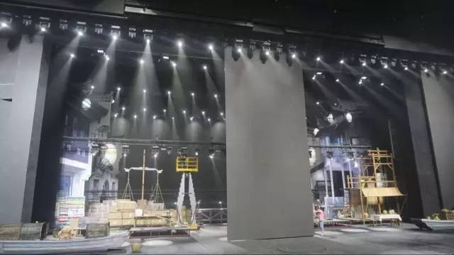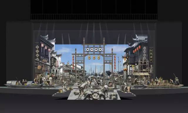 记者看到,在金色大厅已基本成形的舞台上面,摆放着两艘颇具江南特色的小船,货物、小饭桌、箩筐、还有充满水墨画质感的码头风景……尽管没有太多耀眼的灯光辅助,眼前的这个大舞台上的布景已颇具美感。