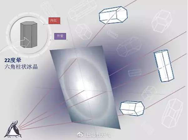 “ 22°晕”色彩鲜明﹐内红外紫,红色往往表现得较清晰而紫色不明显。出现 22°晕的卷云中存在数以百万计的六角柱状冰晶,大家可以想象2B铅笔的形状,当六角柱状的垂直轴,相当于铅笔笔芯垂直于太阳光时,光线经过冰晶发生折射和色散就形成了 22° 晕。晕的颜色分布与冰晶的大小具有明显的相关性,冰晶较大、个体和分布越均匀,晕的颜色就越鲜艳清晰。
