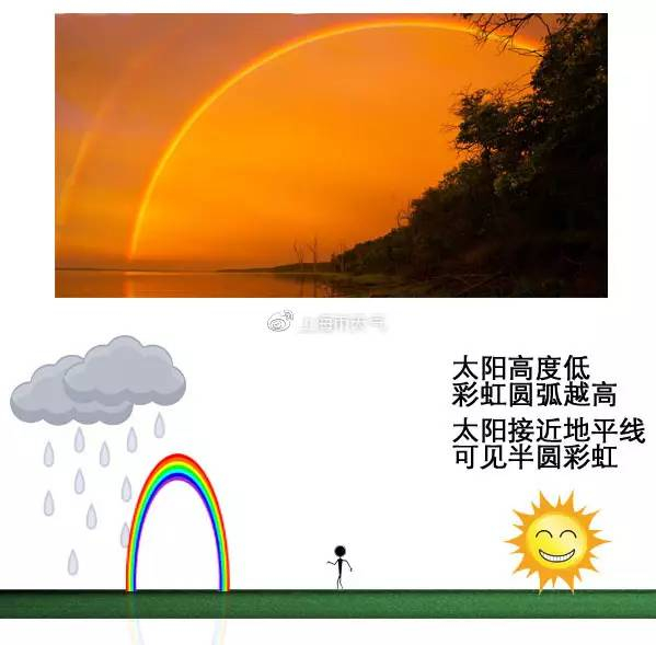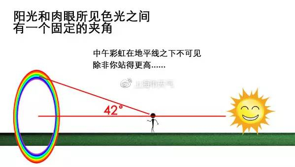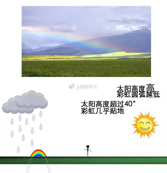其他条件适宜,太阳高度较低时,看到的彩虹更接近半圆;相反,当太阳高度升高,差不多超过40°时,在地面上就见不到彩虹了。