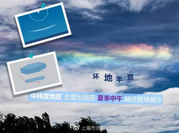 出现 “环天顶弧”的卷云是由扁平的六角片状冰晶组成,光线从冰晶的上平面进入,经折射从侧面射出,表现为靠近天顶的接近半圆的彩弧。弧的大小常会随太阳高度变化而变化,太阳越高,弧半径越小;当太阳高度高于32°时,它就消失不见。所以在中纬度地区,环天顶弧主要出现在早晨和傍晚。