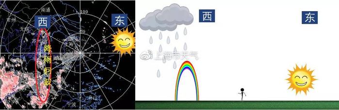 如果早晨太阳在东方升起,而且正有微弱的降雨,空气中水汽较充沛,就有可能看到西面天空出现的彩虹。