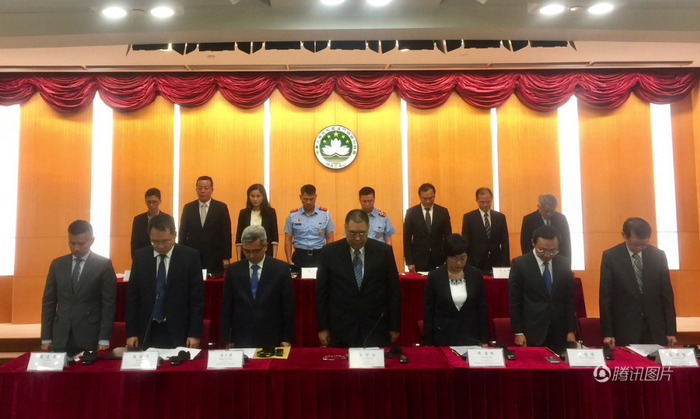 8月24日18点30分,澳门特区行政长官崔世安带领一众官员在特区政府总部召开记者会,介绍特区政府因应台风 “天鸽”的跟进善后工作。在记者会前,出席会议的众人首先为风灾死者默哀一分钟。崔世安在记者会上为救灾不力向澳门居民致歉,并指澳门气象局局长冯瑞权辞职已获批。