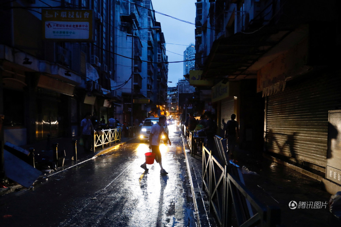 台风过后,澳门大面积停电,昔日霓虹闪烁的葡京娱乐场也是黑灯瞎火。