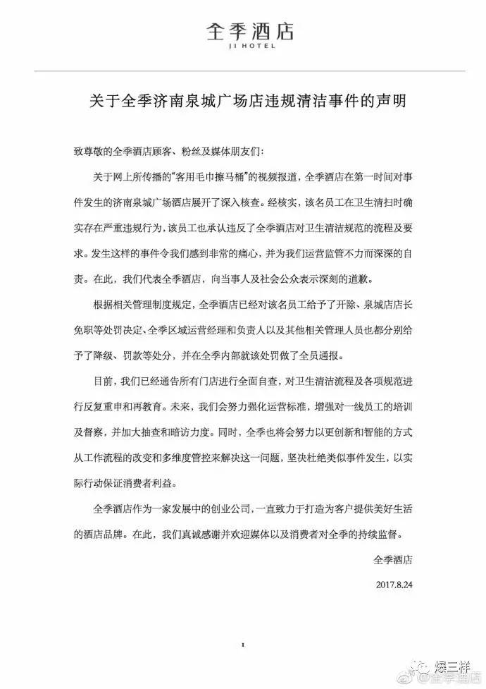 8月24日晚间,全季酒店官方微博发布“关于全季济南泉城广场店违规清洁事件的声明”称,“全季酒店对事件发生的济南泉城广场酒店展开了深入核查。经核实,该名员工在卫生清扫时确实存在严重违规行为,该员工也承认违反了全季酒店对卫生清洁规范的流程及要求。在此,我们代表全季酒店,向当事人及社会公众表示深刻的道歉。”