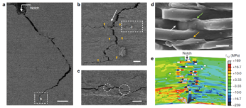 (a)SEM图像显示了在开口弯曲测试中,大尺度的裂纹偏转;(b)SEM图像显示了裂纹偏转、分叉、以及萌生的多级裂纹;(c)SEM图像显示了接近裂纹末端的裂纹桥;(d)SEM图像显示了磷酸钙微纳片的拔出,海藻酸钠聚合物的桥连、牵引;(e)非线性有限元模拟人工珍珠层材料的破坏过程。