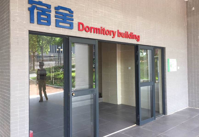 宿舍有8层和11层的,都有电梯。宿舍为6人间,一间宿舍大概有20平方左右,另带阳台。每位学生都配备了储物柜。宿舍24小时提供热水,空调、电扇一应俱全。每间宿舍都配备了2个洗手间,同时也是冲凉房。
