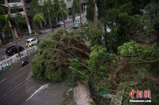 8月23日,今年第13号台风“天鸽”正面袭击澳门,最大阵风达17级,澳门悬挂自回归以来的首个十号风球。受其影响,海陆空交通中断,海水倒灌。图为街上树木被连根拔起。 中新社记者 龙土有 摄