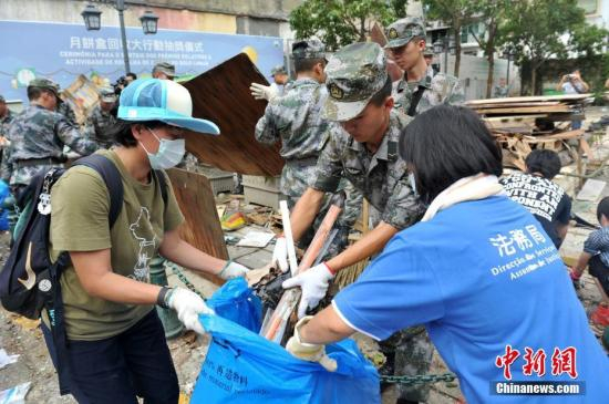 今年第13号台风“天鸽”重创澳门。8月25日,解放军驻澳门部队根据中央军委命令,出动官兵约千人,协助澳门特区政府展开台风“天鸽”灾后救助,保护市民生命财产安全,尽快恢复正常生产生活秩序。图为军民联手清理垃圾。 中新社记者 龙土有 摄