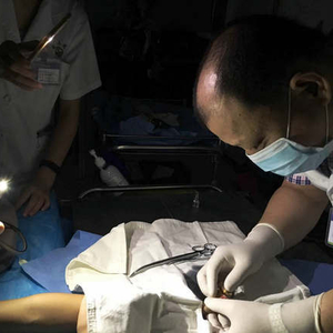 急诊科冯涛医生在手机照明下为病人缝合、清创伤口