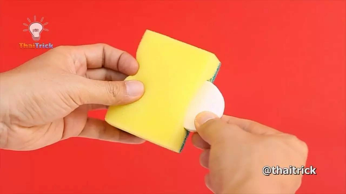 快用完的肥皂头个头太小不好拿,用海绵开一道口子,把肥皂塞进去。
