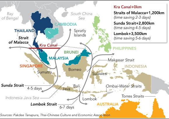 这个项目是在泰国湾和安达曼海之间开挖一条穿越泰国地峡、长达135公里的运河,从而缩短印度洋与太平洋之间大约1200公里(或是2至3天)的行程,耗资280亿美元。它相当于亚洲的苏伊士运河或巴拿马运河,但是修建难度会更大。