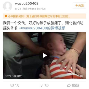近日,微博上一位网友@wuyou200408 发布一段视频,称孩子在湖北省妇幼保健院做康复理疗,结果被医生摇成脑瘫。视频中的孩子被猛摇头部、拧脖子数十次,哭闹不止。这则微博一时引发了大量的关注。