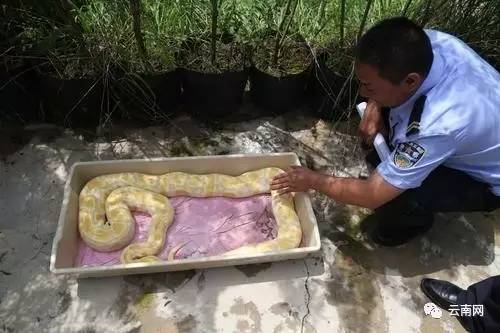7月17日,昆明市呈贡区,市民在一块玉米地里发现一条长2.7米、重10公斤的黄金大蟒,这条黄金大蟒盘在玉米地里,皮肤白而光滑,体积非常庞大,3位民警花了很长时间才将它制伏。