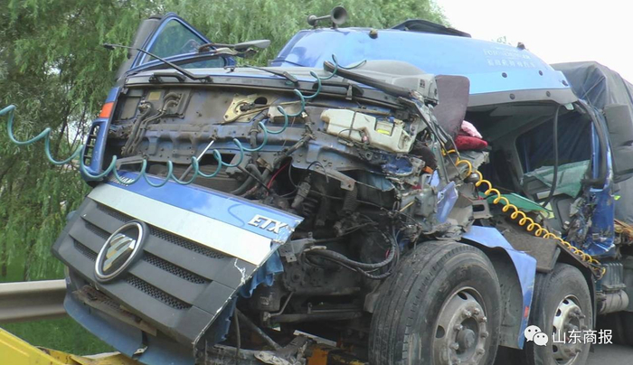 据了解,车祸发生在济南黄河二桥南头附近,半挂车不知何因追尾大货车的右后侧,巨大的冲击力把半挂车的驾驶室撕开。半挂车失控,司机当即掉下车来被自己的车碾压过去,失控的车直到冲出近百米撞到护栏上才停下来,被碾压的司机当场身亡。 据了解,车上还有一名司机,事发时正在驾驶室睡觉,车停下后自己从车里爬出来,并没有受伤。