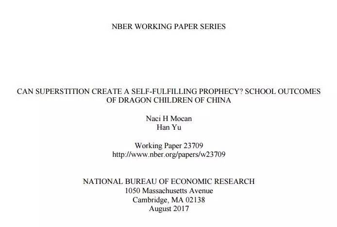 每经小编(微信号:nbdnews)看到,这篇论文是由路易斯安那大学的Naci.H.Mocan和Han Yu两位研究员撰写的,题为《“迷信”能创造自我实现的预言吗:中国龙年孩子的学校成绩》。