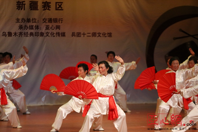 在27支队伍中,天山神韵的20名队员身着太极服,显得格外清新脱俗。这支平均年龄62岁的队伍给大家表演了气功《太极功夫扇》,一动一静,一张一弛间,尽显大气风范。