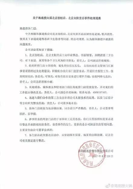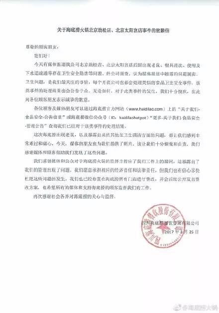 事件被曝光后,海底捞官方微博第一时间承认了错误,并向广大的食客表示道歉。承认涉事门店存在卫生安全隐患等问题,表示“十分惭愧和自责”,愿意承担相应的经济与法律责任,也将对所有门店进行整改。