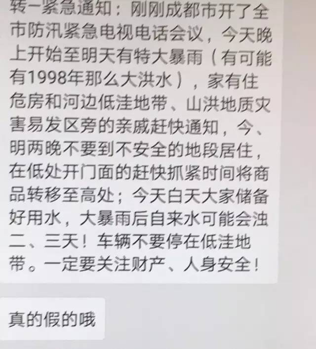 消息称,“刚刚成都市开了全市防汛紧急电视电话会议,今天晚上开始至明天有特大暴雨(有可能有1998年那么大洪水)……”