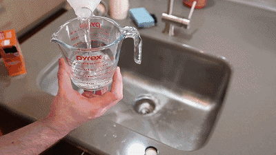 接着,向水槽口里倒上一小碗苏打粉(约200克),然后再浇上小半碗食醋,这时两者会发生化学反应产生一些气泡,等待约4-5分钟,待其充分溶解水管壁上的油污和锈渍。