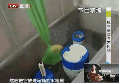 找一个旧丝袜,把肥皂头装起来,放在马桶水箱里,马桶盖压住丝袜边让它固定好。