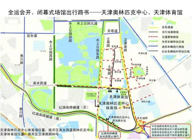 外环线(卫津南路至秀川路)将设置第十三届全运会临时专用占路停车场,上述路段(含公众停车场)禁止一切社会车辆停放(持有第十三届全运会开幕式专场车证车辆除外)。
