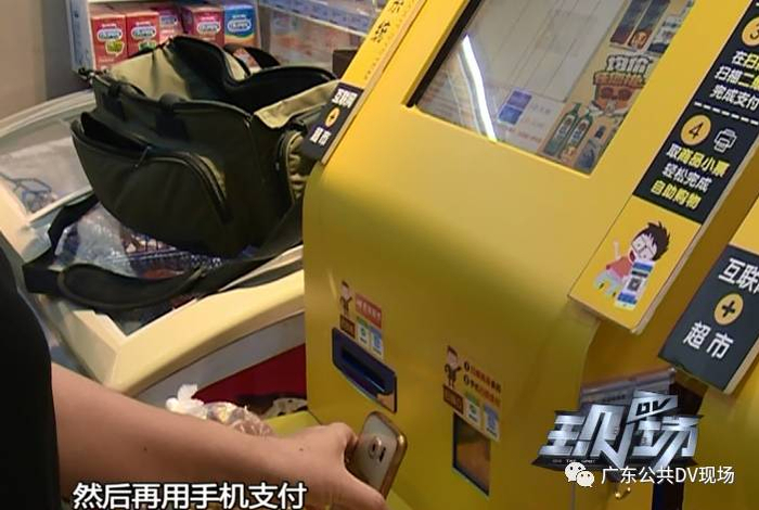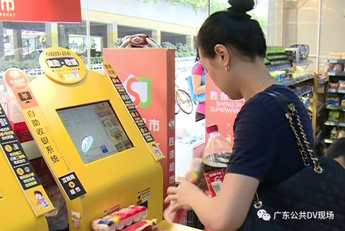在越秀区小北的一间超市里面,记者看到在人工收银柜台旁边,摆着两台醒目的黄色“机器”,很多街坊拿着商品过去“刷”两下,轻轻松松就走得,原来这台就是自助收银机。