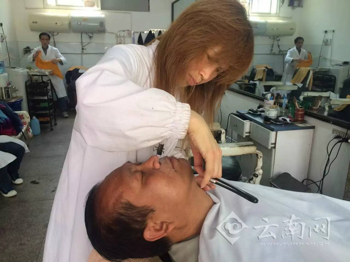 用胡刷把肥皂沫均匀地刷在顾客脸上