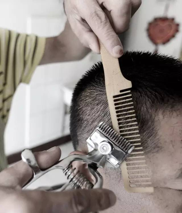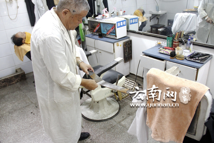 这时候理发师傅就要用挂在椅子上的牛皮磨一磨刀片