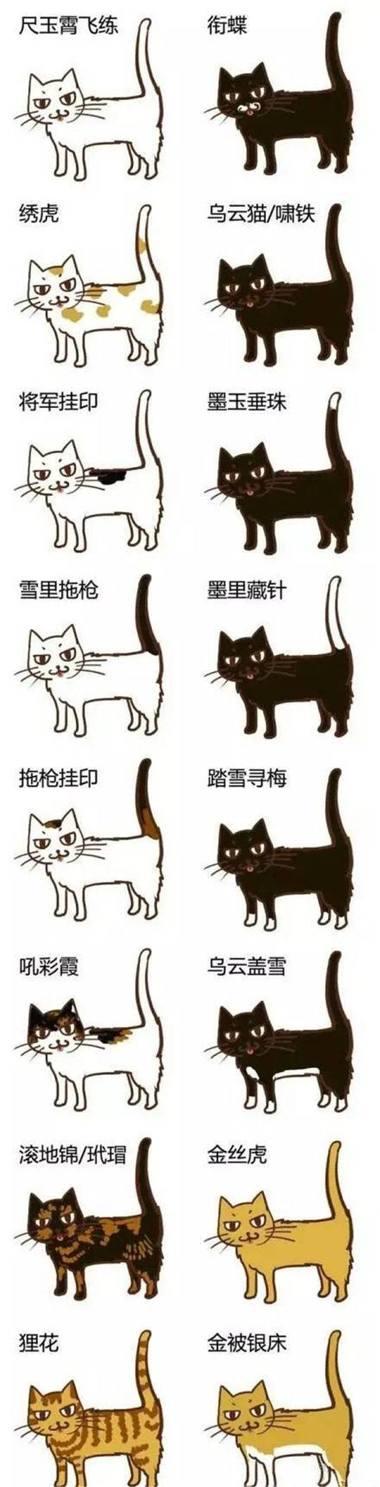 比如,黑猫有白长毫或白眉须叫“墨里藏针”,浑然一体没有杂毛的叫“四时好”,全身黄毛但肚皮是白的叫“金被银床”,纯黑色的猫叫“哮铁”或是“乌云”,……