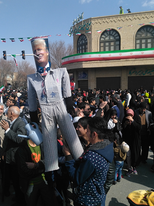 全场群情激昂,喊声震耳欲聋。随后是阿訇和官员讲话,以及伊斯兰革命卫队的阅兵式。有人在广场四周放起火来,把印有美国总统特朗普头像的假人烧成灰烬。
