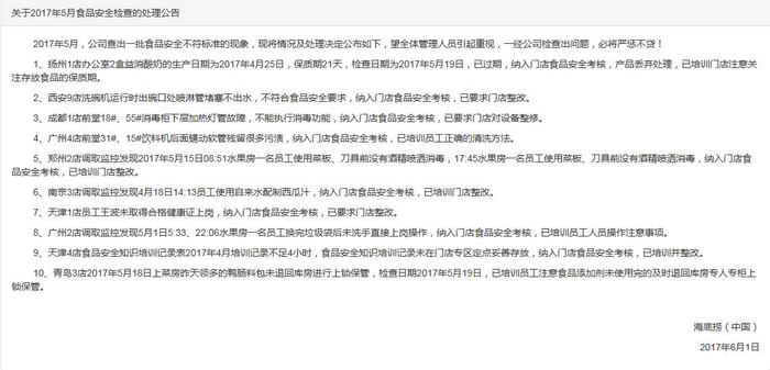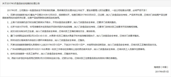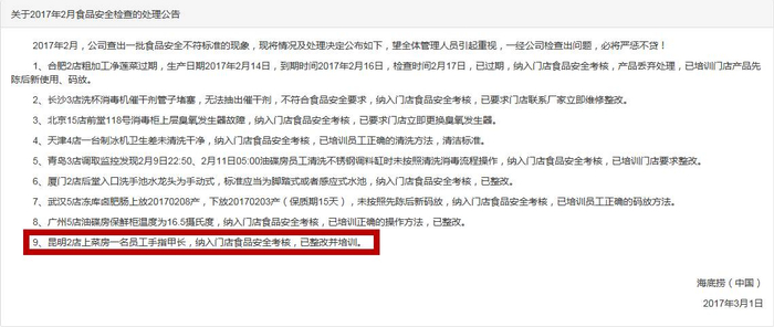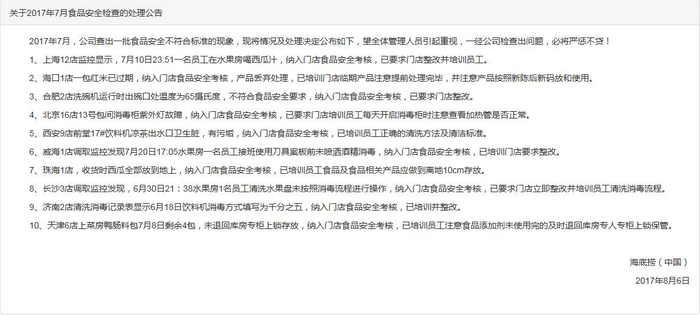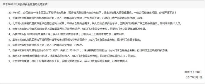 不过,最近有网友发现,海底捞在其官网每月会发布“关于食品安全检查的处理公告”,网友称:打开海底捞官网,我看吐了!