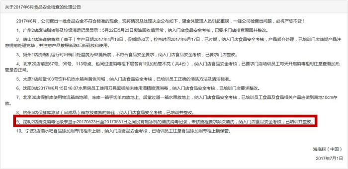 其中,6月和2月,昆明的海底捞都被发现有问题需要整改。